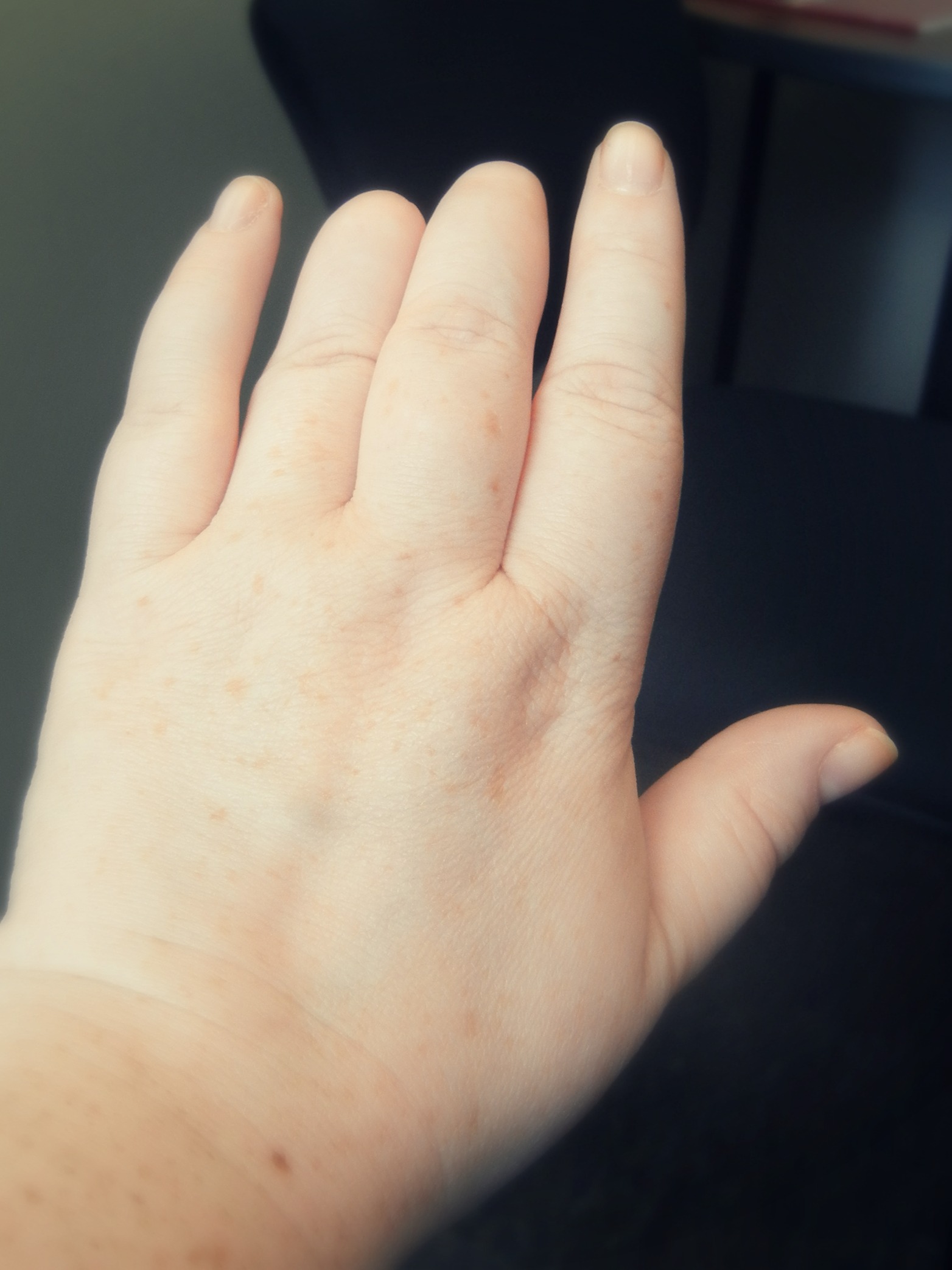 I knew everyone would want to see, so I’m posting this pic of my left hand. I took about one million shots, but no matter what, my hand looked chubby. I am, indeed, that pale, however. 🙂