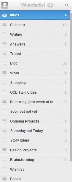 I use the free version, and there I keep a whole series of lists. I have one for each book, one for calendar events, one for OCD Twin Cities, etc., etc. Here’s a list of my lists.