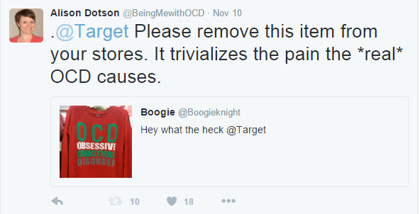 By now you’ve probably heard of the controversy over a holiday sweater Target is carrying this season. It reads “OCD Obsessive Christmas Disorder.” On the surface, it’s “just a sweater.” At least that’s what people keep telling me. They’ve also told me it isn’t making fun of OCD, and that “compulsive” is a pretty key word to the whole term. Of course, I think “obsessive” and “disorder” are pretty key words as well, and they’re included on the shirt.