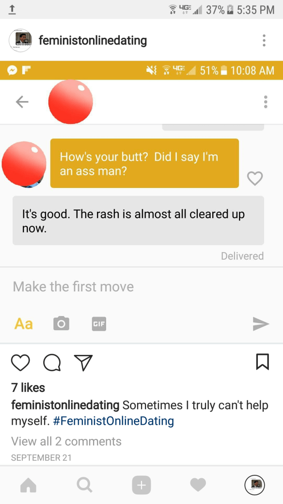 Wow girl! That was hilarious, but also, BLA sad about the state of BOYS. I’m not even going to say men. Thanks for sharing this. I bet it’s making a lot of other women feel more normal and less alone in the online dating world!