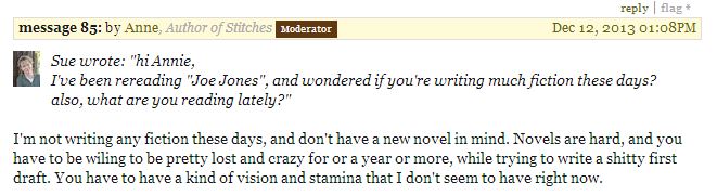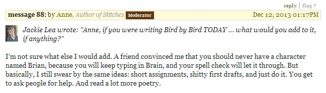 Goodreads hosted an event “Ask Anne Lamott” this past week, and just now, I have found the time to sift through her responses.  You need to know that Anne Lamott always seems to be speaking directly to my heart– we are both writers, Christians, and women who wildly, desperately need help– and so all of her responses to various reader-posed questions felt like balm.  This one, in fact, felt like validation: